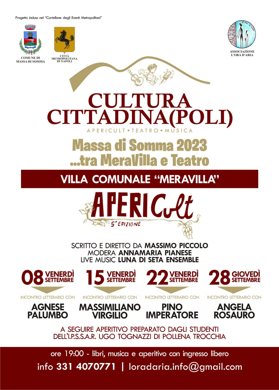 La terrazza del Parco Comunale “Meravilla”, di Massa di Somma, ospiterà la 5° edizione del Festival Letterario “Apericult... la cultura si fa in strada”, consolidata tradizione letteraria/musicale/enogastronomica che prevede incontri letterari con scrittori rappresentativi del territorio.